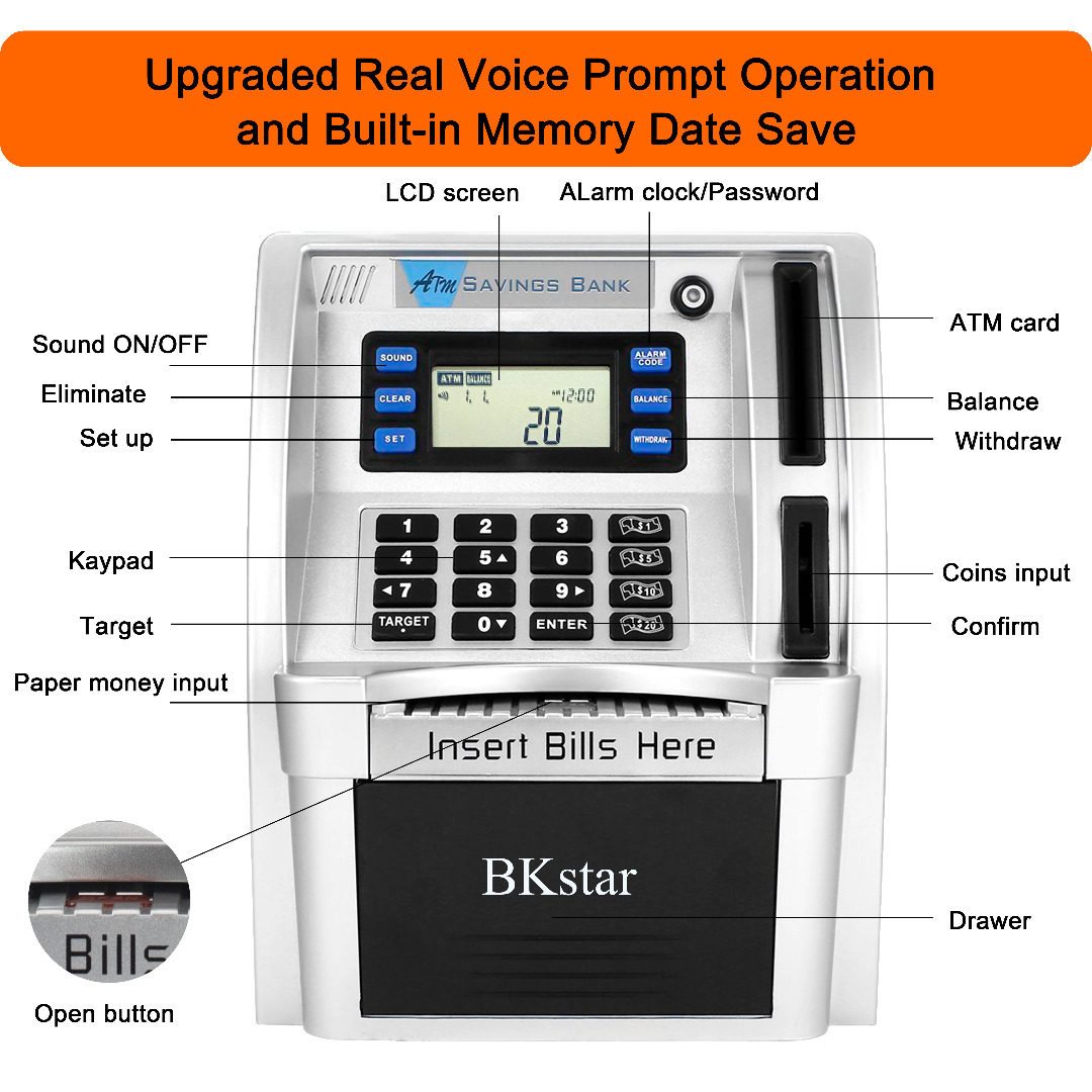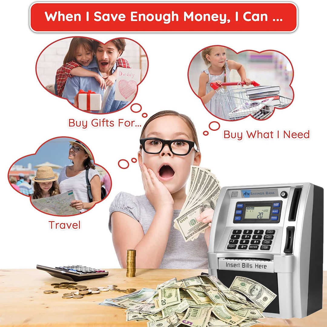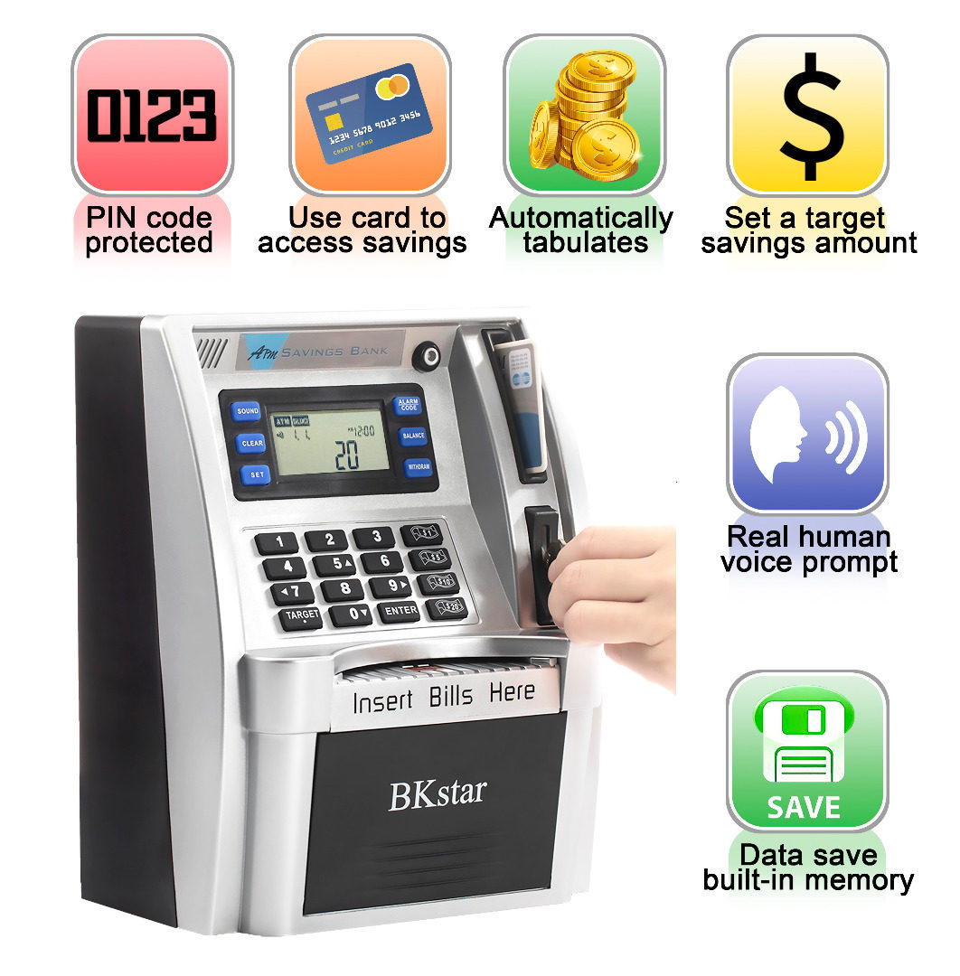 2022 Upgraded Kids Talking Piggy Bank, ATM Savings Toy Bank for Real Money with Real Voice Prompt, Deposit, Withdraw, Debit Card, Saving Target, Timer and Clock