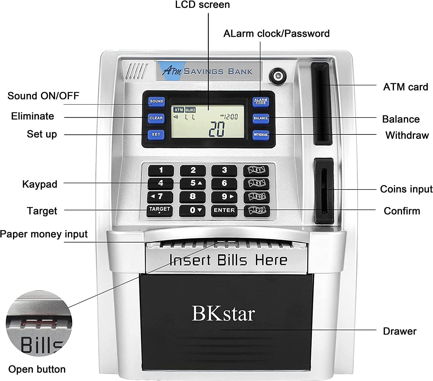 * Targets Setting--Press BALANCE key to check your balance,Press TARGET key,children could check the LCD display to see the amount that is still needed to reach their goals.An interesting way to teach your boys or girls how to save money and track their savings.