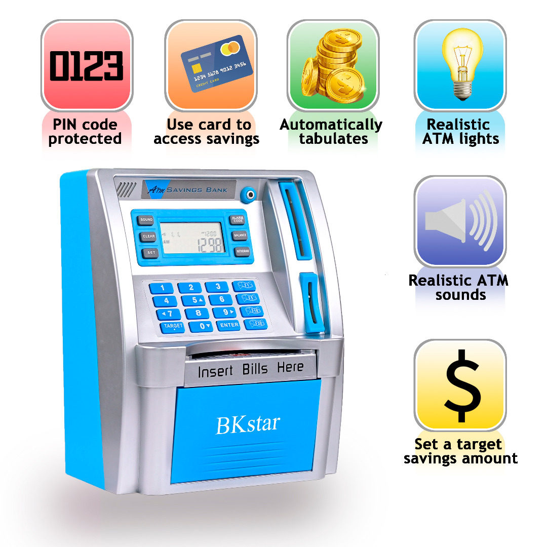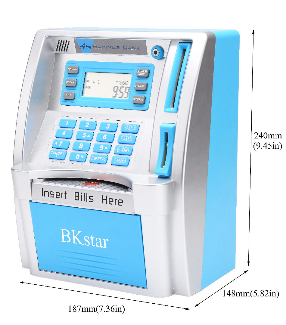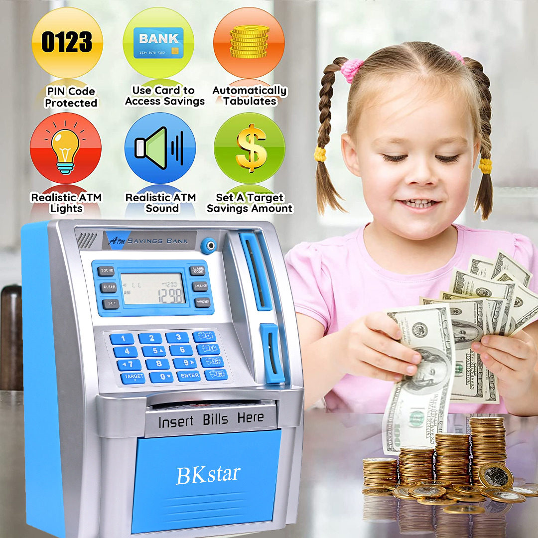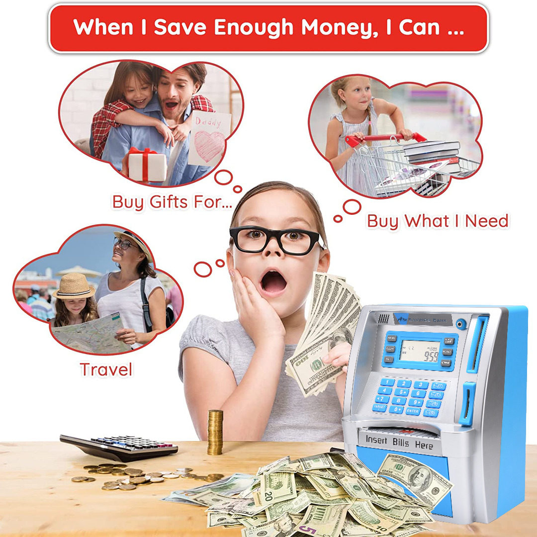 2022 Upgraded Blue ATM Savings Piggy Bank Machine for Real Money with Card, Coin Reader and Electronic Balance Calculator Money Bank for Kids Adults