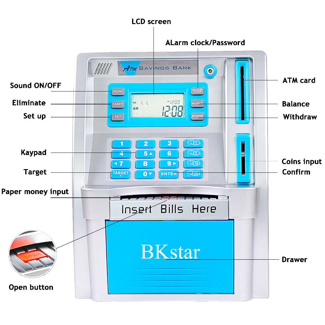 * Targets Setting--Press BALANCE key to check your balance,Press TARGET key,children could check the LCD display to see the amount that is still needed to reach their goals.An interesting way to teach your boys or girls how to save money and track their savings.